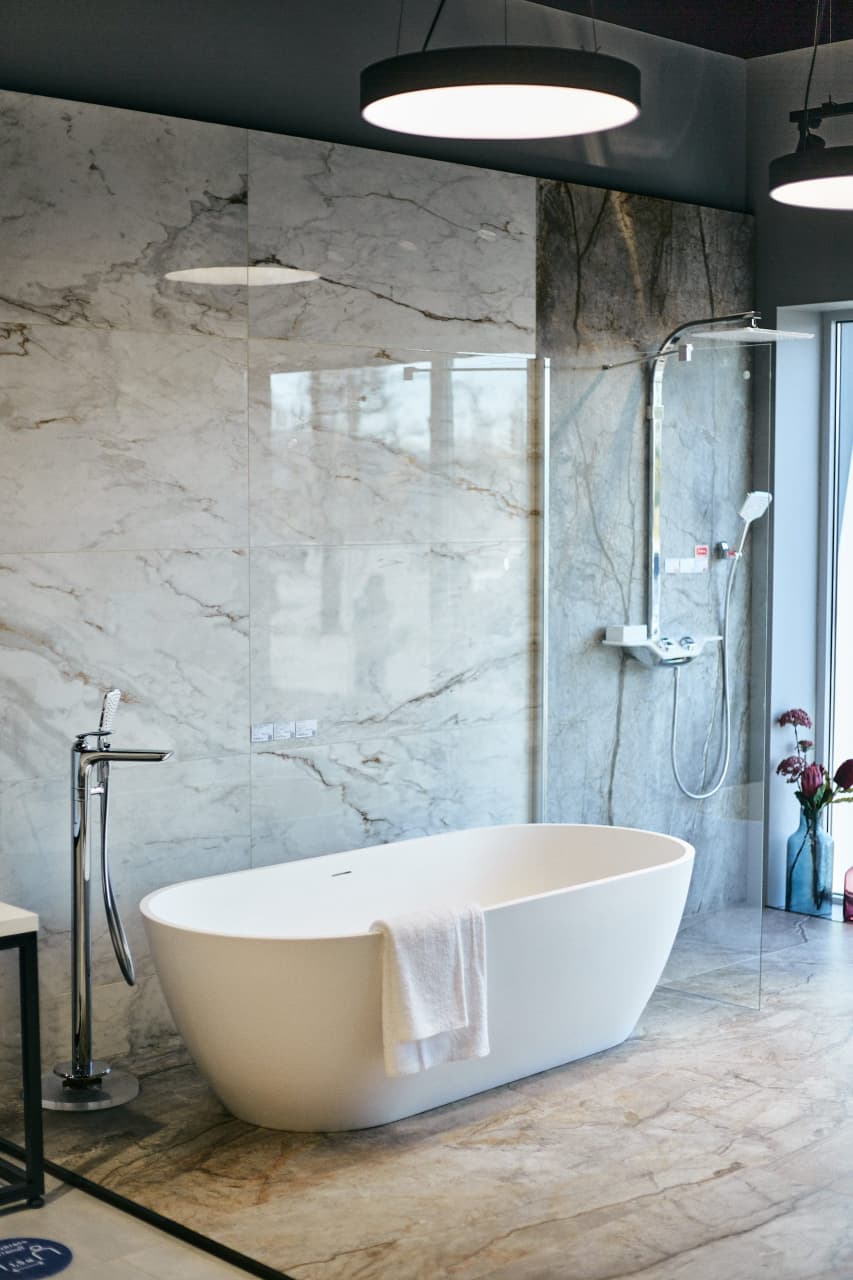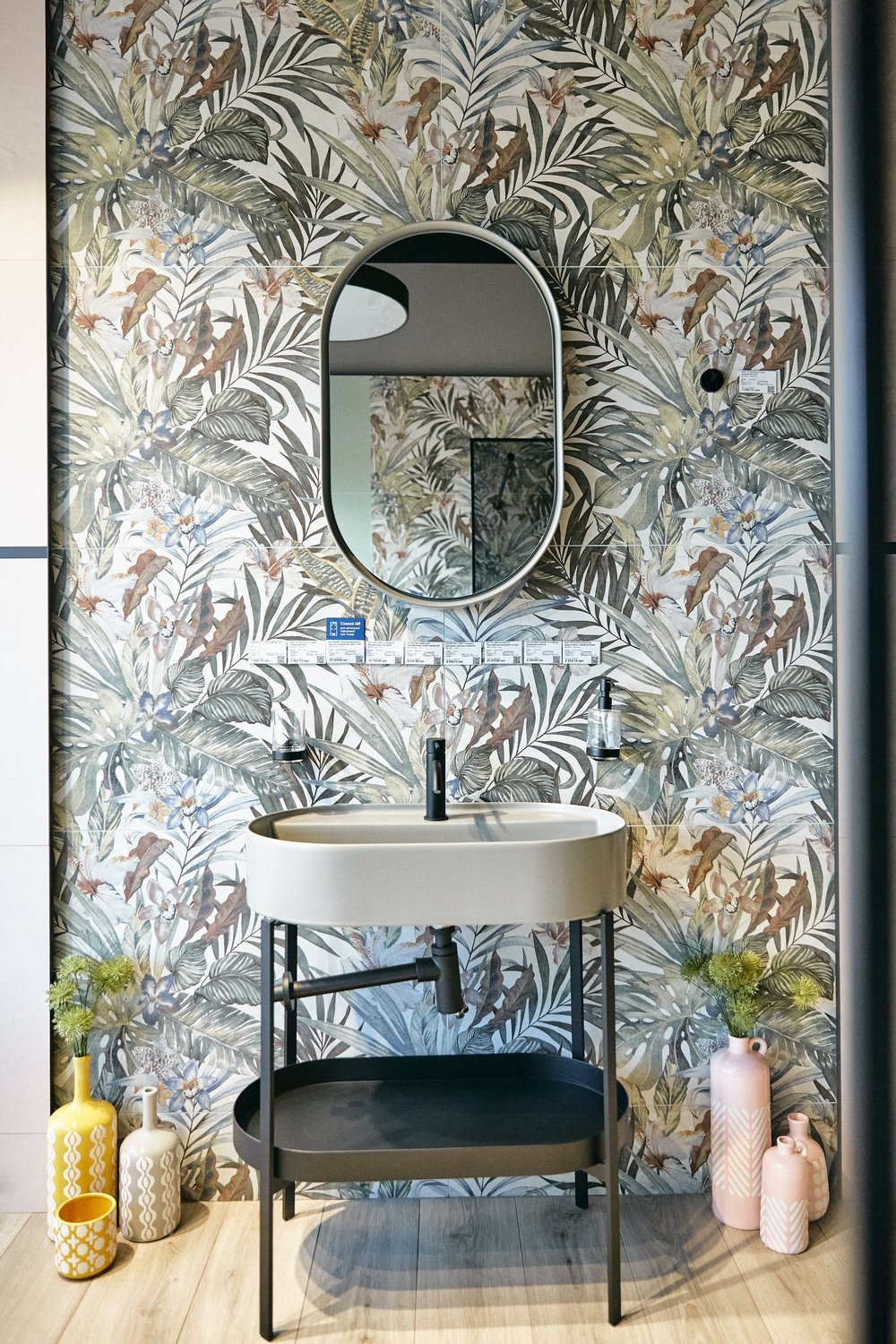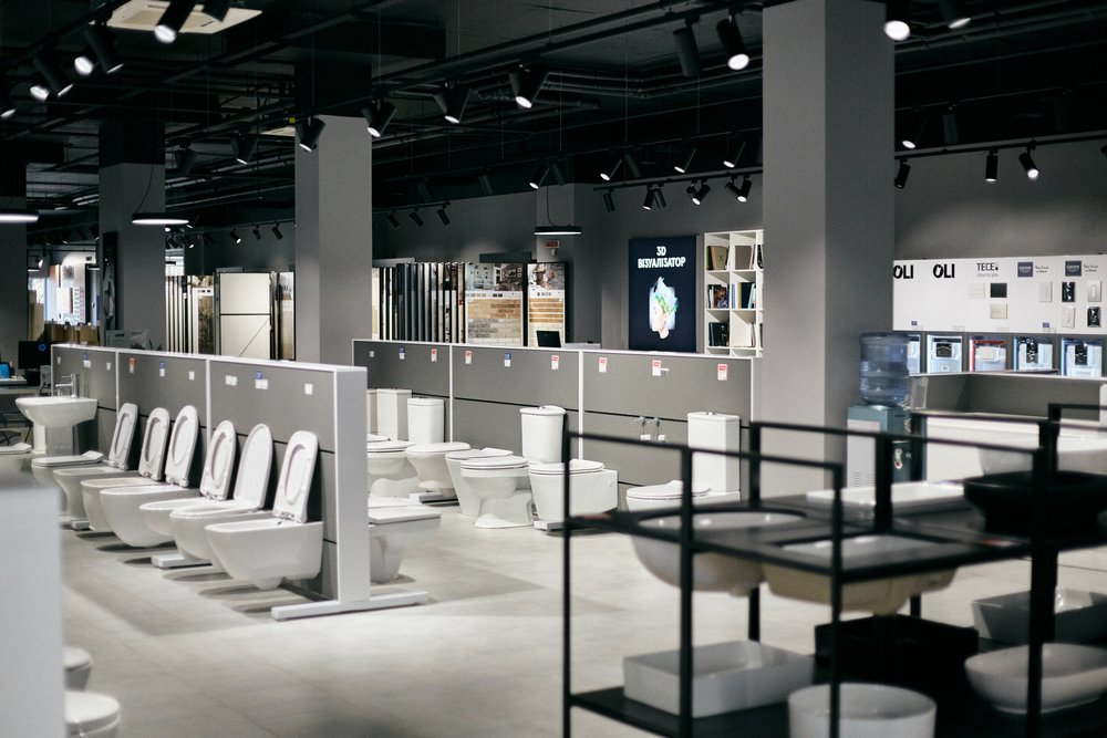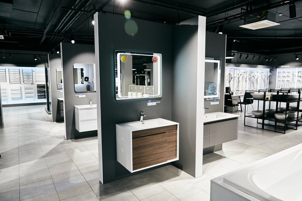 Отдельная зона выделена под готовые решения для ванной комнаты, являющейся визитной карточкой Агромат. Значительную часть магазина занимают именно профессионально оформленные шоу-румы, призванные предоставить клиентам множество идей, что и с чем комбинировать для создания стильного интерьера.