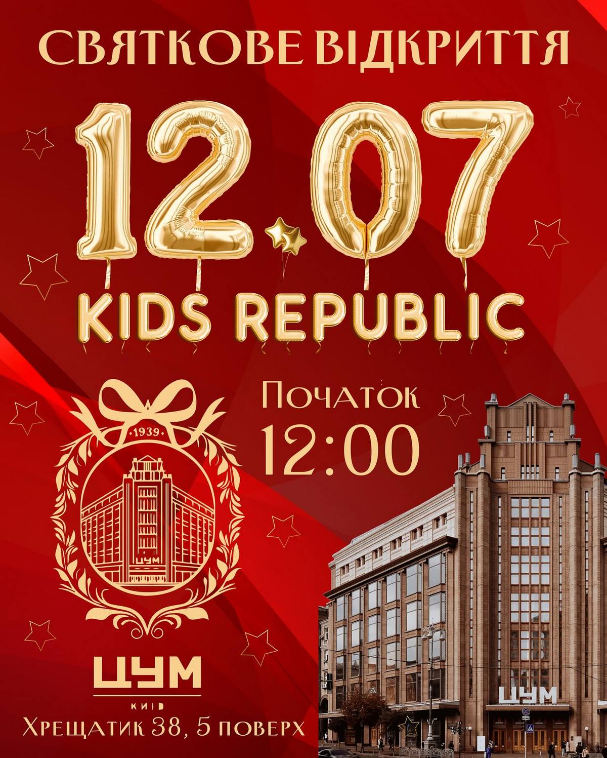 12 июля на пятом этаже в столичном ЦУМ (Киев, ул. Крещатик, 38) состоялось праздничное открытие нового детского магазина сети Kids Republic. Первых клиентов ожидала развлекательная программа с интересными фокусами, мастер-классами для детей, подарками и вкусностями. Этот магазин стал шестым в Киеве (вдобавок к локациям в ТРЦ Respublika Park, ТРК Lavina Mall, ТРЦ Ocean Plaza, ТРЦ River Mall, ТРЦ Gulliver). Еще один магазин работает в Киевской области в пгт. Козин (ул.Партизанская, 30). Два магазина Toys Republic работает в Испании (г. Аликанте) и еще два Kids Republic – в Венгрии (Будапешт).