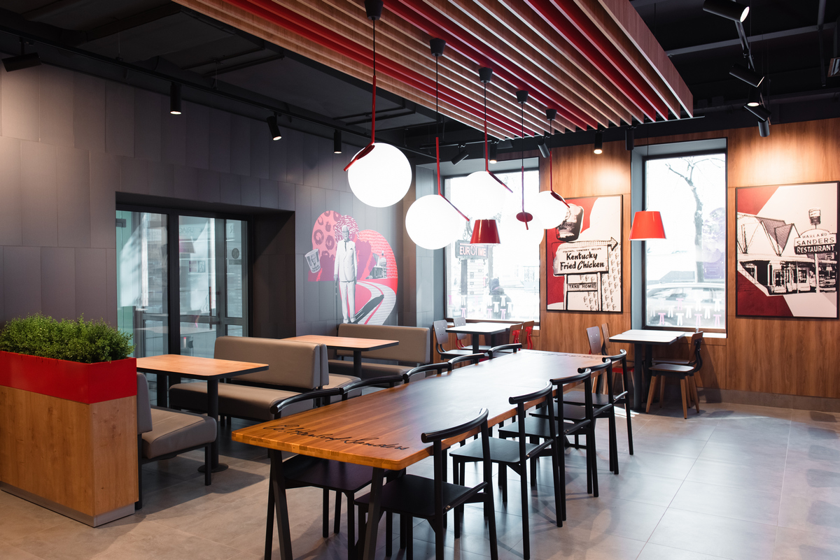 Площадь заведения – около 288 кв. м, в нем предусмотрено 86 посадочных мест, чтобы гости могли с комфортом отведать фирменные блюда KFC.