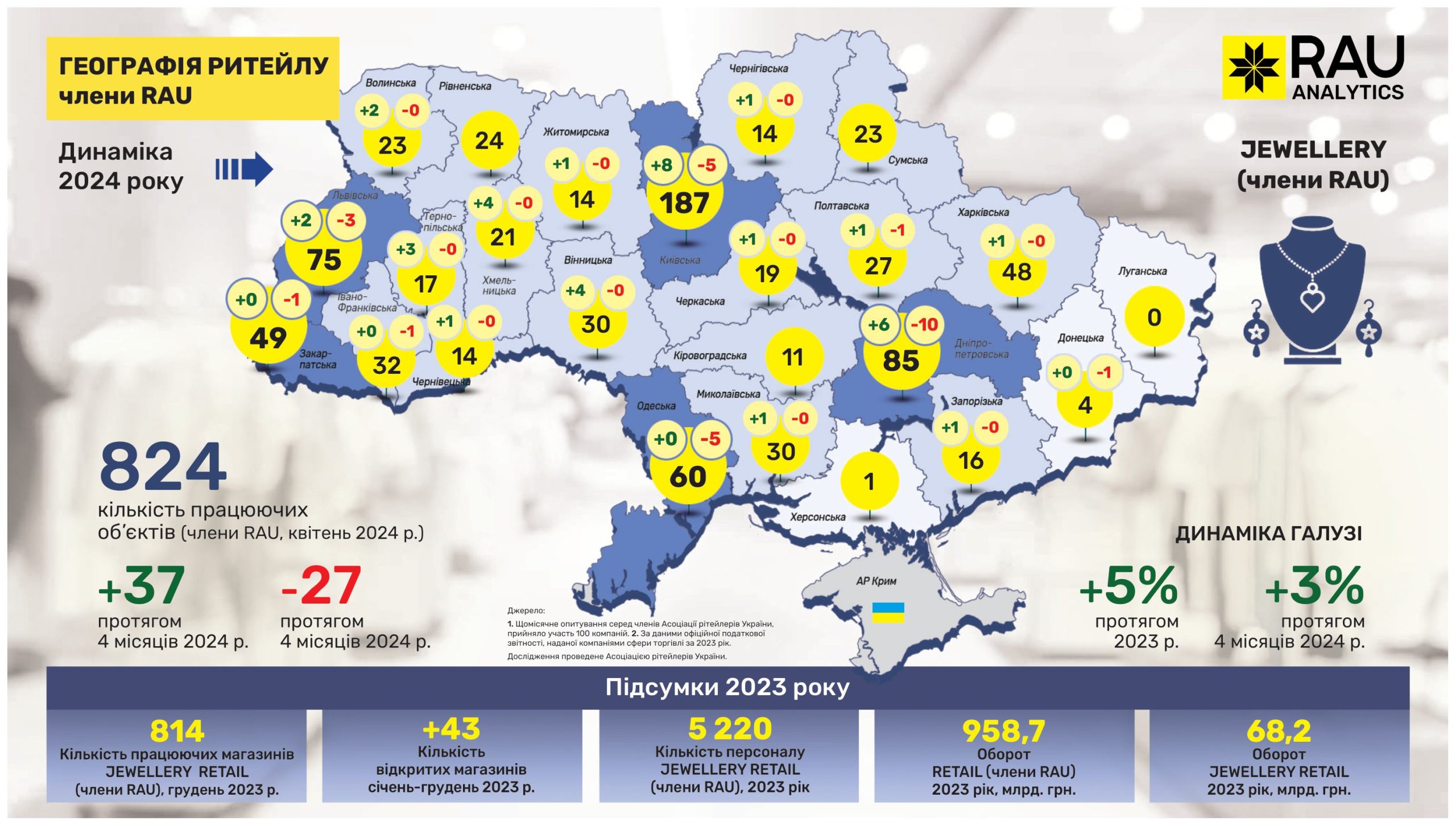 В рамках RAU Expo-2024 уже во второй раз состоялась презентация аналитических исследований о развитии ритейла в Украине под названием “География ритейла”. На основе данных сетей, являющихся членами RAU, участникам мероприятия представили информацию о том, как изменилась география ритейла в 2024 году и какова динамика развития отрасли по регионам. В частности, торговля ювелирными изделиями, которая больше всего пострадала от российского вторжения, довольно неплохо возобновляется. Так, по состоянию на апрель 2024 года работало 824 точки. За четыре месяца прибавилось 37 магазинов, соответствующая динамика составляет +3%. В прошлом году было открыто 43 магазина, что имело соответствующую динамику в 5%. Львиная доля торговых точек приходится на столичный регион (187), Днепр (85) и Львов (75), а в топ-5 регионов входят Одесщина и Закарпатье. При том, что по всей Украине в этом году ювелирные магазины почти не закрывались, определенное сокращение произошло в местах наибольшей концентрации данного сегмента ритейла. Причем больше всего в Днепре – сразу на 10 магазинов.
