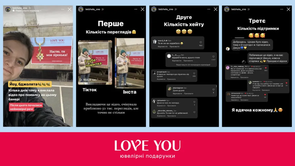 В феврале бренд ювелирных подарков Love You запустил новую коммуникацию, в которой лично признается своим клиентам в любви. Однако Юлия Дейнега, преподавательница украинского языка и литературы заметила неточность на рекламном баннере бренда Love You и опубликовала об этом видео в TikTоk и Instagram. В видео говорится о следующем правиле украинского языка: короткие формы имен с окончанием «Я» в именительном падеже (например, Таня), имеют окончание «Ю» в звательном падеже — Таню. А вот имя Настя – исключение и пишется с «Е». Следовательно, нужно актуализировать свои знания и запомнить новые правила и исключения.