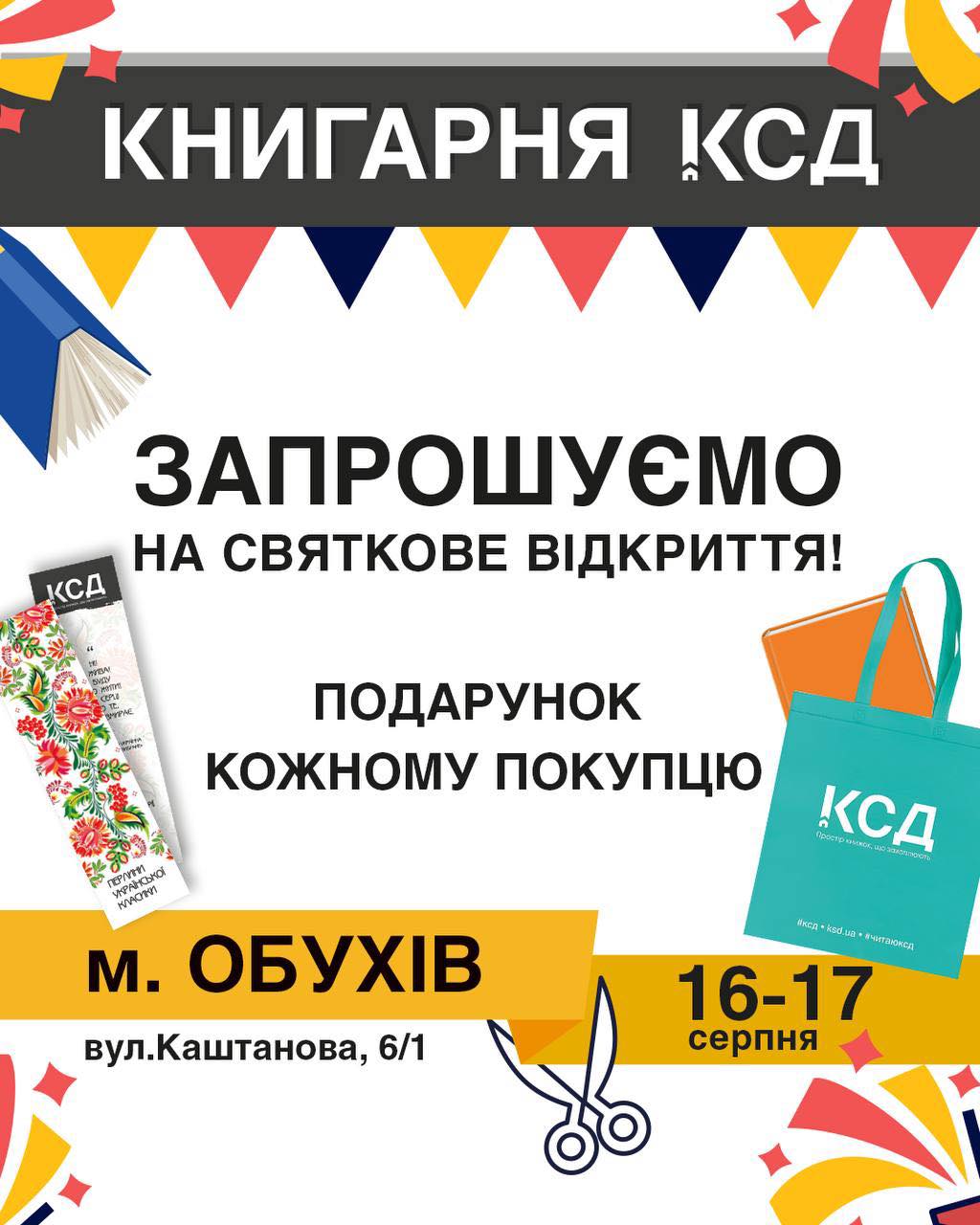 Сеть книжных магазинов КСД открыла 16 августа новую торговую точку в городе Обухов под Киевом по адресу ул. Каштановая, 6/1.