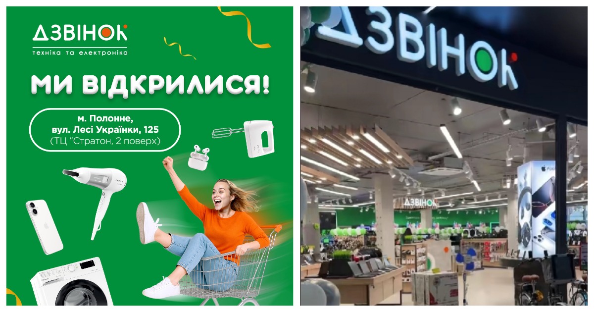 Сеть магазинов бытовой техники и электроники Дзвінок, работающая с 2010 года и имеющая с десяток локаций в Сумской, Ровенской, Полтавской, Черниговской, Волынской областях, открыла новую торговую точку в городе Полонное на Хмельнитчине. Магазин открыт на втором этаже в ТЦ Стратон по улице Леси Украинки, 125. Дзвінок – это полноформатный мультибрендовый магазин с ассортиментом, который удовлетворит потребности любого клиента.