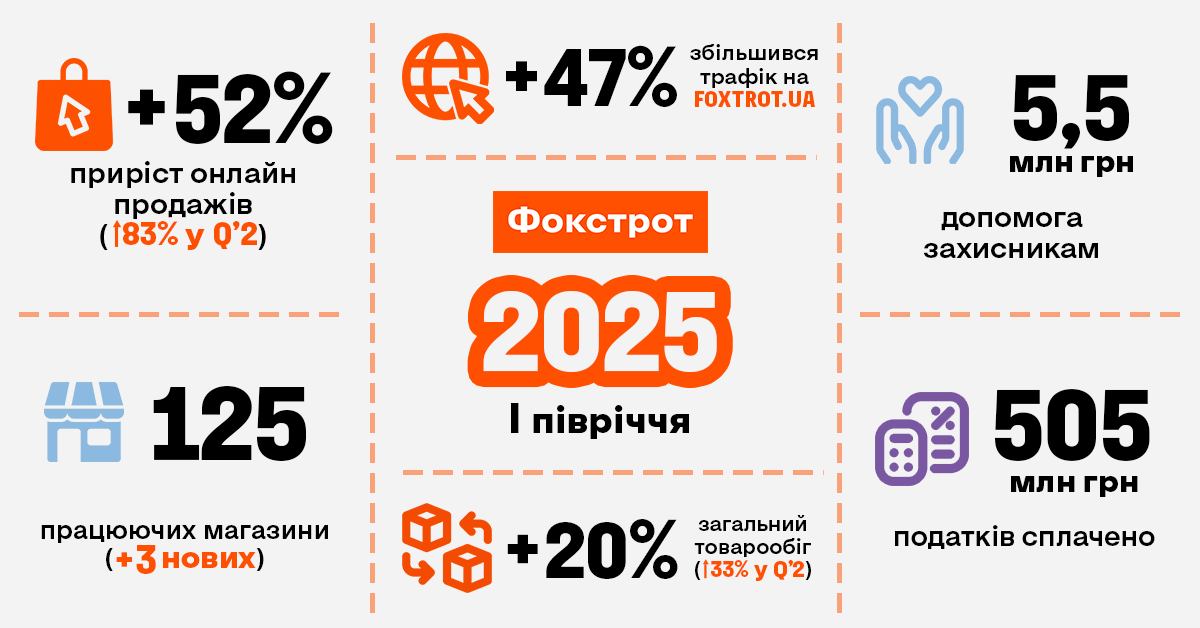 Онлайн-продажи на foxtrot.ua за полгода выросли почти на 52%, а во втором квартале – на впечатляющие 83%. Количество онлайн-заказов увеличилось на 63%, а трафик сайта – на 47%. В первом полугодии 2025 года товарооборот вырос на 20% по сравнению с аналогичным периодом прошлого года. Особенно динамичным стал второй квартал, где прирост составил 33%. Среди категорий-драйверов – кондиционеры (прирост более чем в 2 раза), мультипечи (в 4 раза), кофемашины, пылесосы, встроенная кухонная техника (в 1,5 раза).