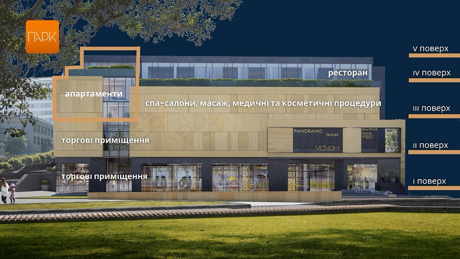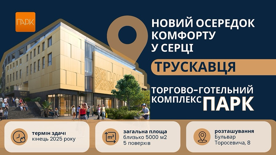 Новый ТЦ Парк – проект, объединяющий апартаменты, торговые площади и ресторанное пространство. Его строят в самом центре Трускавца по адресу: бульвар Торосевича, 8. Общая площадь объекта 4900 кв. м и 5 этажей, говорится на странице Facebook. Известно, что работы по строительству уже завершаются, и срок его сдачи – конец 2025 года.