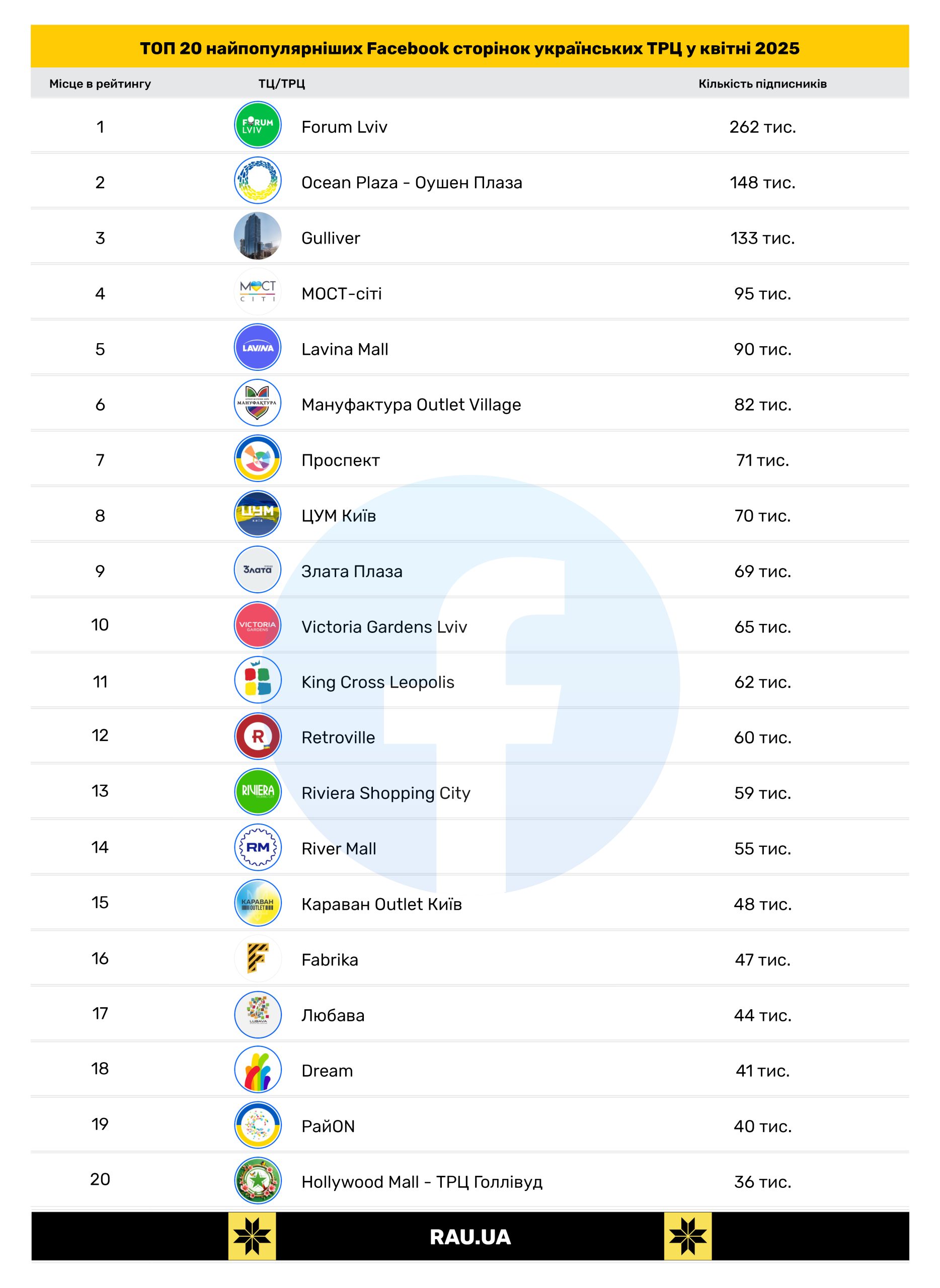 Поэтому в Facebook стабильно лидерство со значительным отрывом держит львовский ТРЦ Forum Lviv, имея 262 тысячи подписчиков.