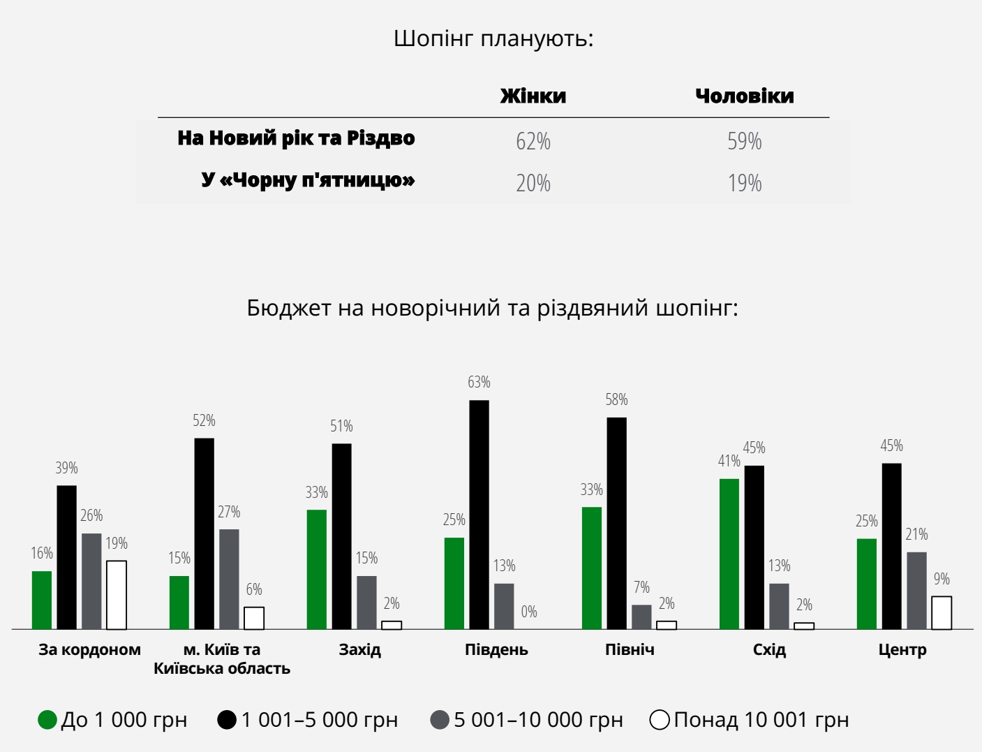 Стоит отметить, что 52% планирующих новогодний шопинг готовы потратить на него от 25% до 50% месячного дохода, а 14% даже готовы привлечь кредитные средства. Больше всего планируют тратить жители Киева и области и временно пребывающие за границей. Так, среди временно находящихся за рубежом украинцев наибольший процент (19%) тех, кто готов потратить более 10 000 грн на новогодний и рождественский шопинг.