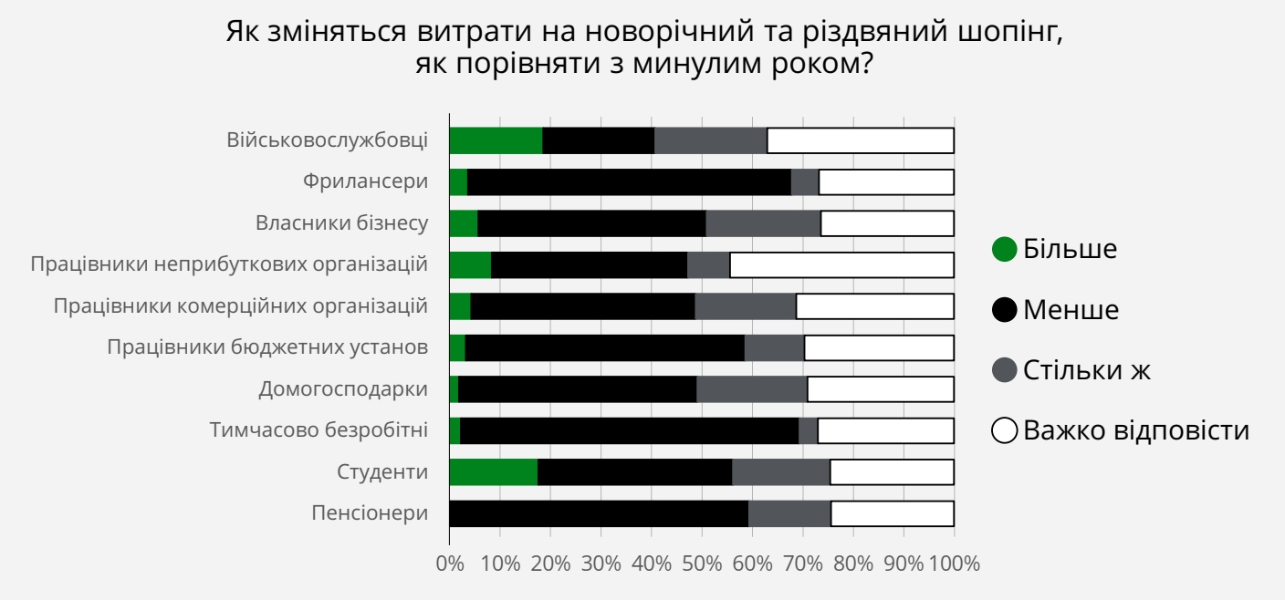 В общем же, из-за войны так же 52% собираются покупать на меньшую сумму, чем в прошлом. Среди тех, кто планирует увеличить расходы, больше всего военных и студентов – около 20%. В то же время, 60% пенсионеров и примерно столько же временно безработных будут экономить.