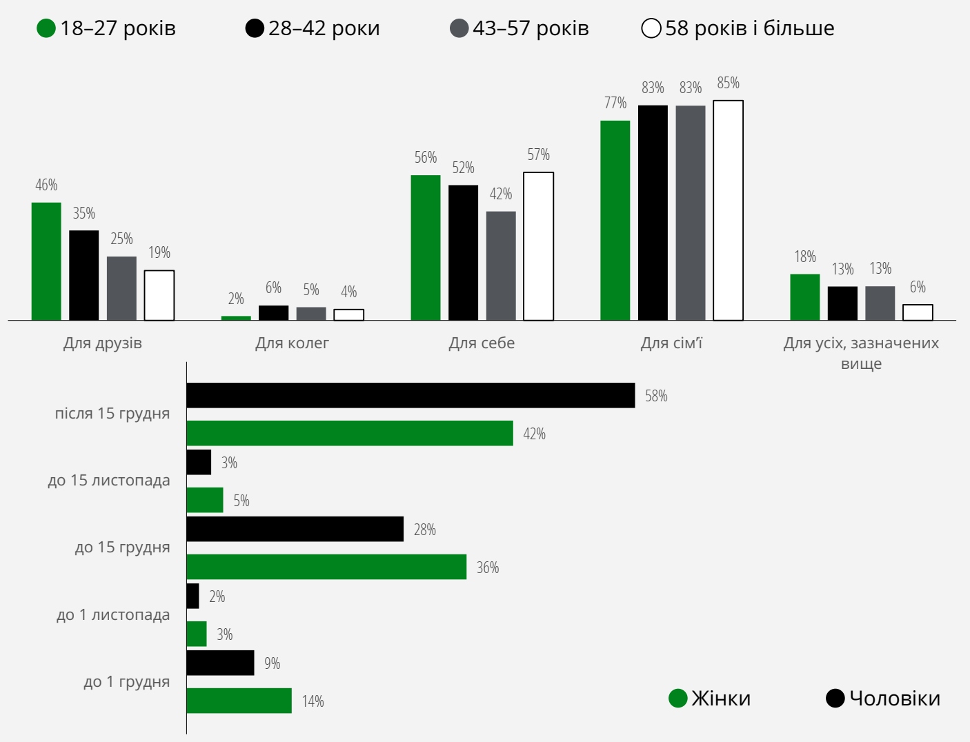 В условиях высокой неопределенности, вызванной войной, новогодний шоппинг украинцев откладывается на вторую половину декабря. Об этом заявила почти половина украинцев, и только 33% планировали начать покупки в первой половине декабря. Для сравнения: в США большинство респондентов обычно планируют завершить праздничные покупки к концу ноября. Интересно, что среди украинцев, которые откладывают закупки, преобладают мужчины (58%), а заранее планируют шопинг женщины.