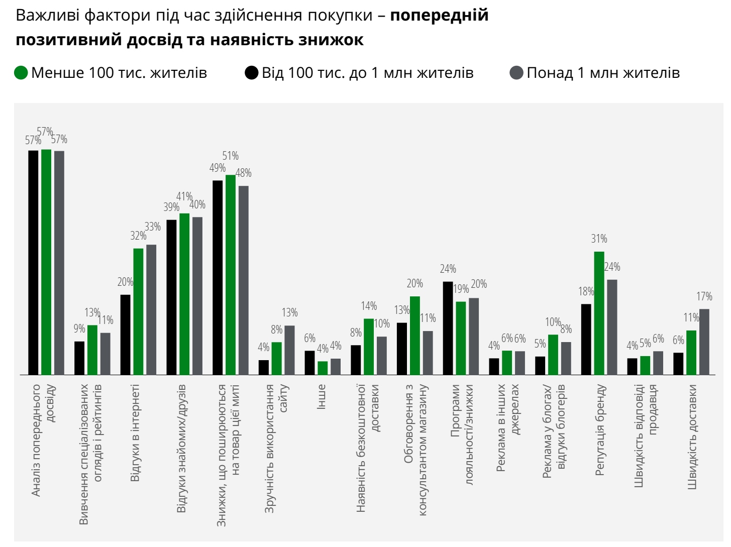 Репутация бренда очень важна для трети потребителей в городах с населением до 100 000 человек. Для них также важен фактор обсуждения с консультантом магазина (20%) и наличие бесплатной доставки (14%). Между тем жителям мегаполисов более важна скорость доставки и вообще удобство оформления заказа и скорость реакции продавца, хотя эти факторы и не являются решающими. Так же, как незначительное влияние любой рекламы.
