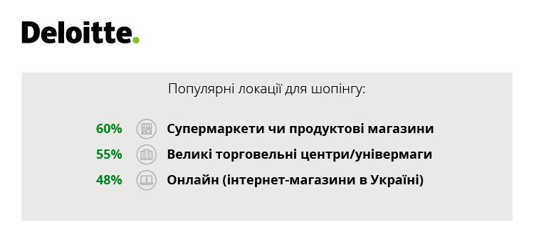 Основным местом для новогоднего и рождественского шопинга станут крупные супермаркеты и торговые центры/универмаги (60% и 55% опрошенных соответственно). Покупки в украинских интернет-магазинах только на третьем месте с показателем 48%.