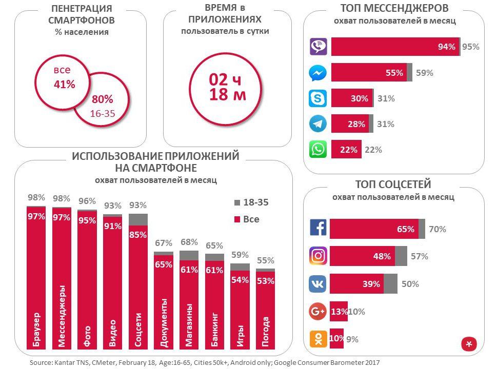Среди мессенджеров во всем мире лидирует WhatsApp, а на втором месте Facebook Messenger (по данным Similarweb). Но не в Украине. Безоговорочное лидерство принадлежит Viber, которым как минимум раз в месяц пользуется 94% владельцев смартфонов (около 40% всего населения Украины). Facebook Messenger занимает второе место с огромным отрывом, а WhatsApp — один из наименее распространенных мессенджеров.
