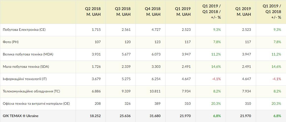 Общий объем украинского рынка бытовой техники и электроники в первые три месяца 2019 года составил почти 22 млрд грн. По информации исследовательской компании GfK Украина, по сравнению с январем-мартом прошлого года продажи бытовой техники и электроники в Украине выросли на 7%.