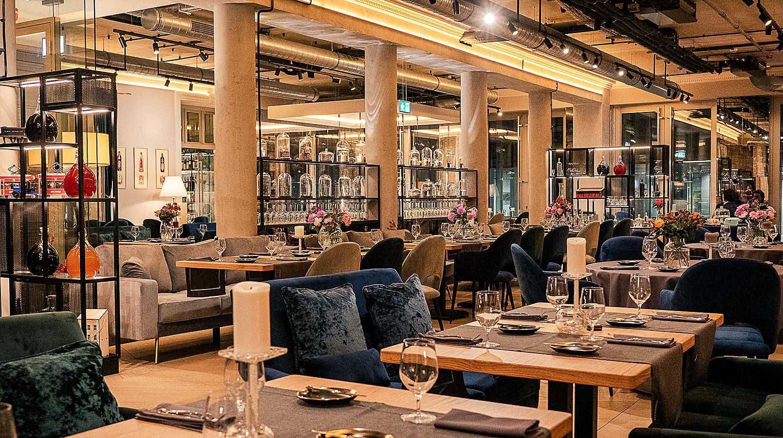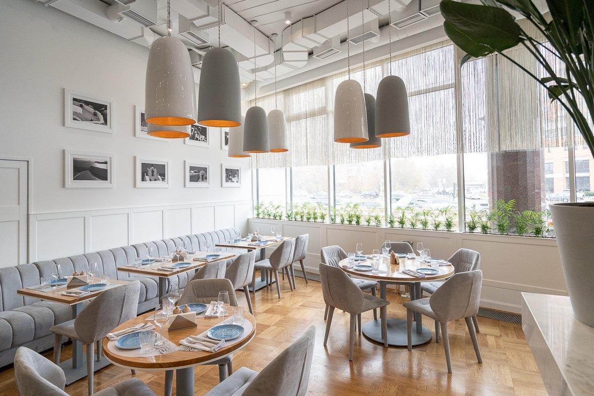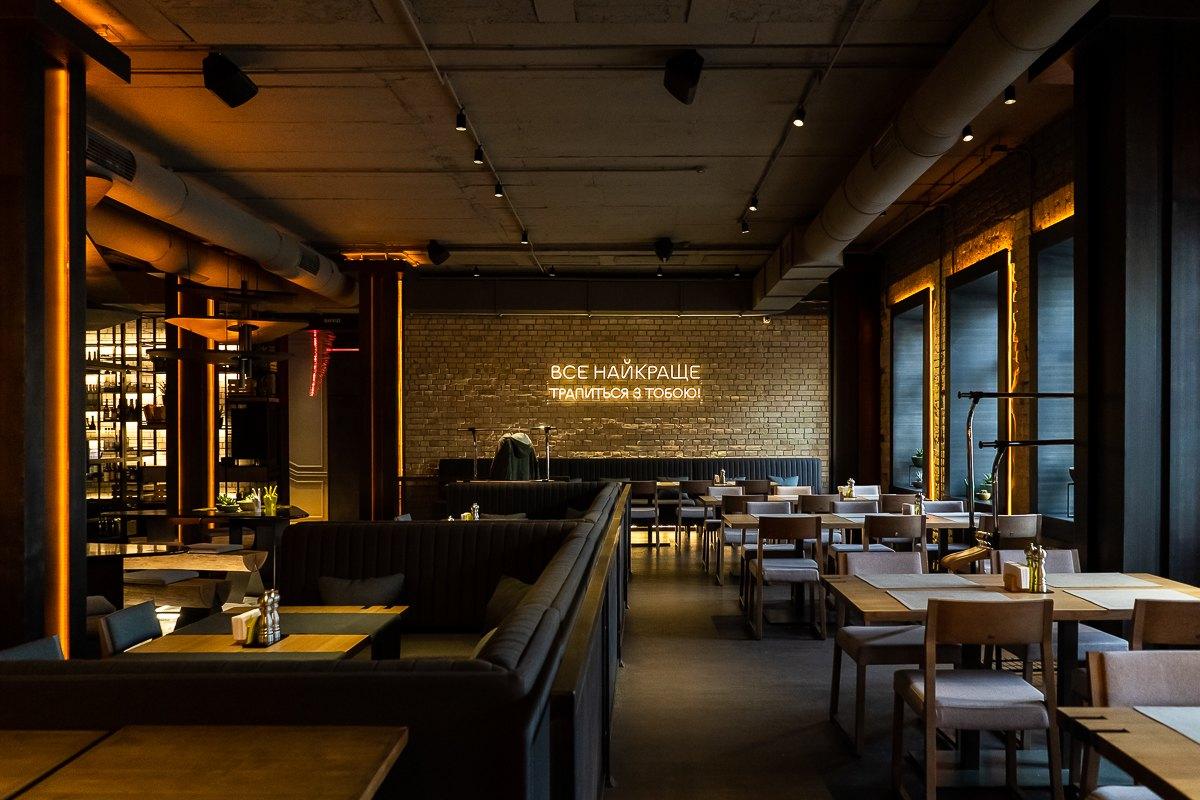 Помещение ресторана разделено на два этажа. На первом уровне – 68 посадочных мест в одном основном и одном отдельном зале, а также открытая кухня. На втором этаже обустроили пространство для проведения мероприятий, еще один зал и открытую кухню, формат которой определяют как Chef’s Table.