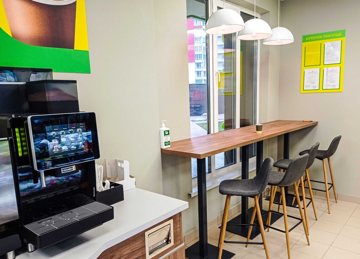 Для удобства клиентов, в магазине выделили место под уютное мини-кафе на пять посадочных мест, где можно подогреть вкусные блюда кулинарии и съесть их на месте.