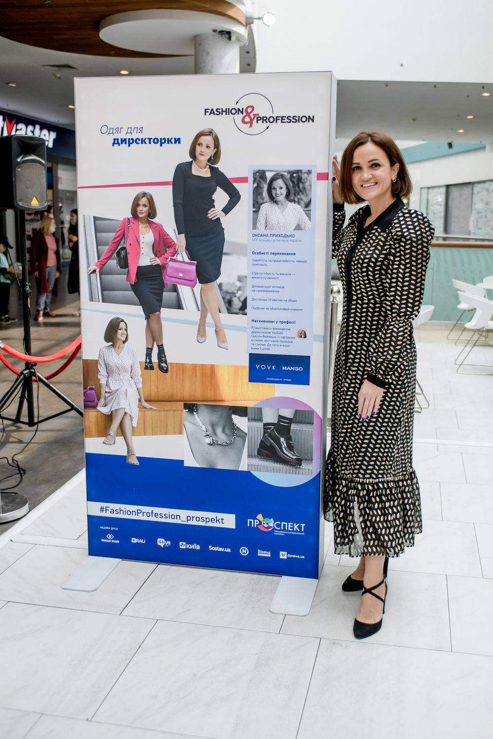 Статическая экспозиция выставки дополнена диджитальным экраном с динамическими роликами о героях, а также интерактивным зеркалом, взглянув в которое, можно сразу оценить и полюбоваться своим стилем. И также стать героем экспозиции Fashion&Profession в ТРК Проспект, опубликовав в социальных сетях свое фото с хештегом #FashionProfession_prospekt. Одной из героинь экспозиции стала Оксана Приходько, СЕО Ассоциации ритейлеров Украины.