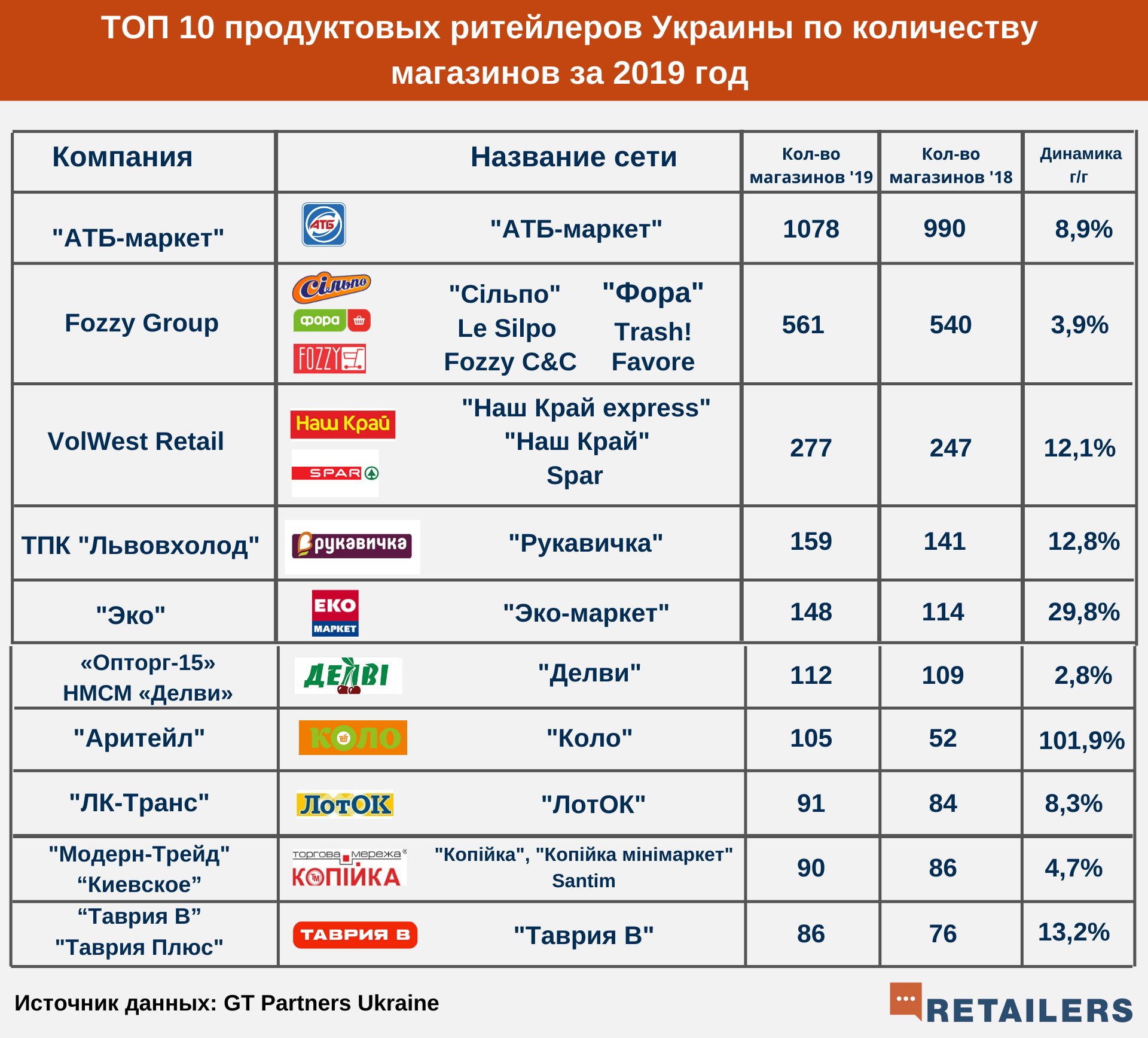 Исследовательская компания GT Partners Ukraine подготовила традиционный отчет о торговых операторах украинского рынка FMCG-ритейла и темпах их развития в 2019 году. Как сообщил портал Retailers со ссылкой на информацию аналитиков, по состоянию на конец 2019-го лидером по количеству магазинов в украинском продуктовом ритейле оставалась сеть АТБ-Маркет, объединявшая 1078 магазинов. В тройке лидеров также разместились группы Fozzy (Сільпо, Фора, Le Silpo, Thrash!, Fozzy C&C, Favore) и Volwest (Наш Край, Spar), которые к концу года насчитывали 561 и 277 магазинов соответственно.