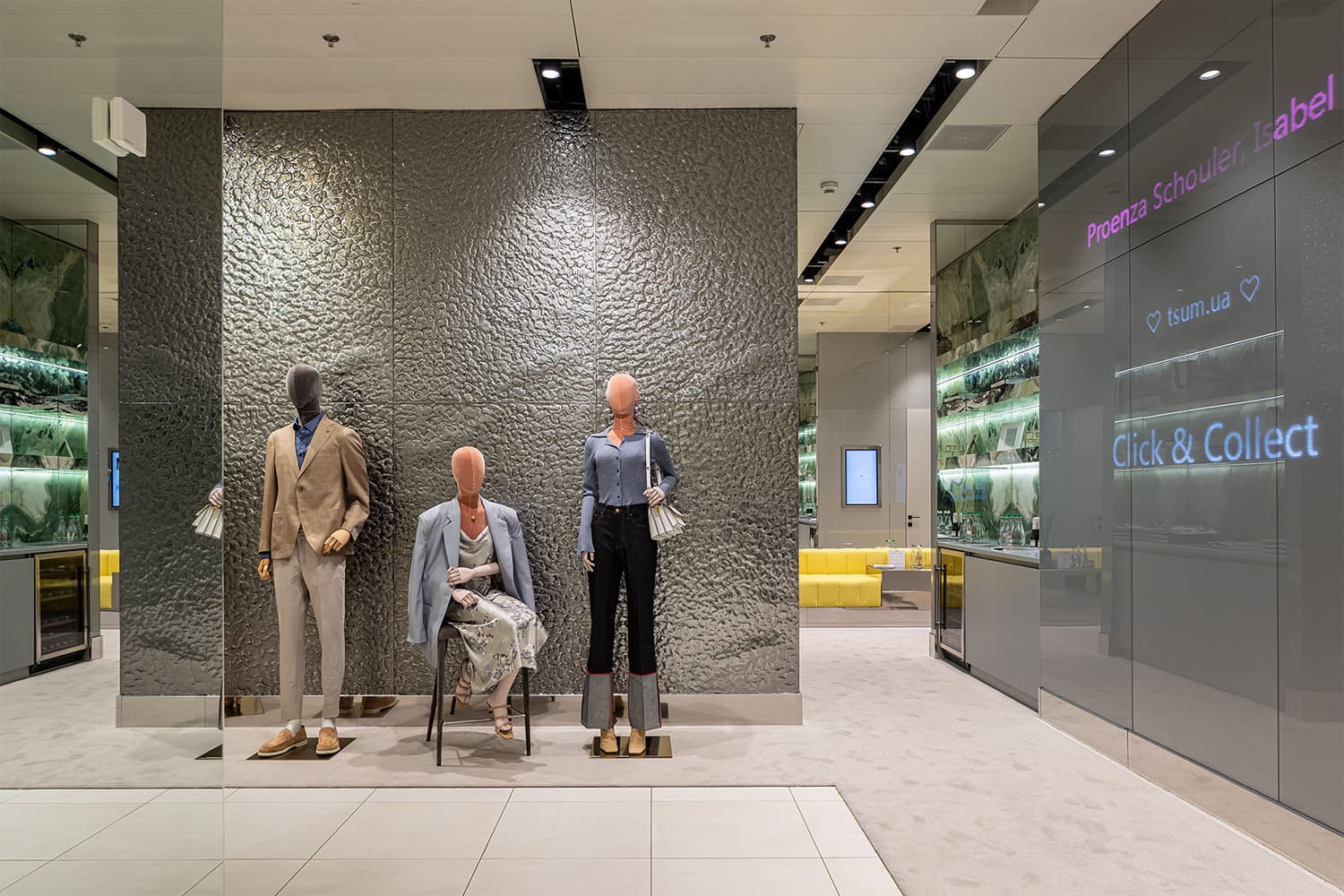 Как сообщила RAU пресс-служба ЦУМ Киев, Click&Collect – это транзитная зона между реальным шопингом и онлайн-магазином. Именно такая концепция была реализована в интерьере. Атмосферу виртуального мира подчеркнули сенсорными панелями с ассортиментом интернет-магазина, насыщенными цветами, футуристическими формами и фактурами. Над дизайном и реализацией проекта работала команда проектного департамента универмага совместно с архитектурным бюро AKZ Architectura.