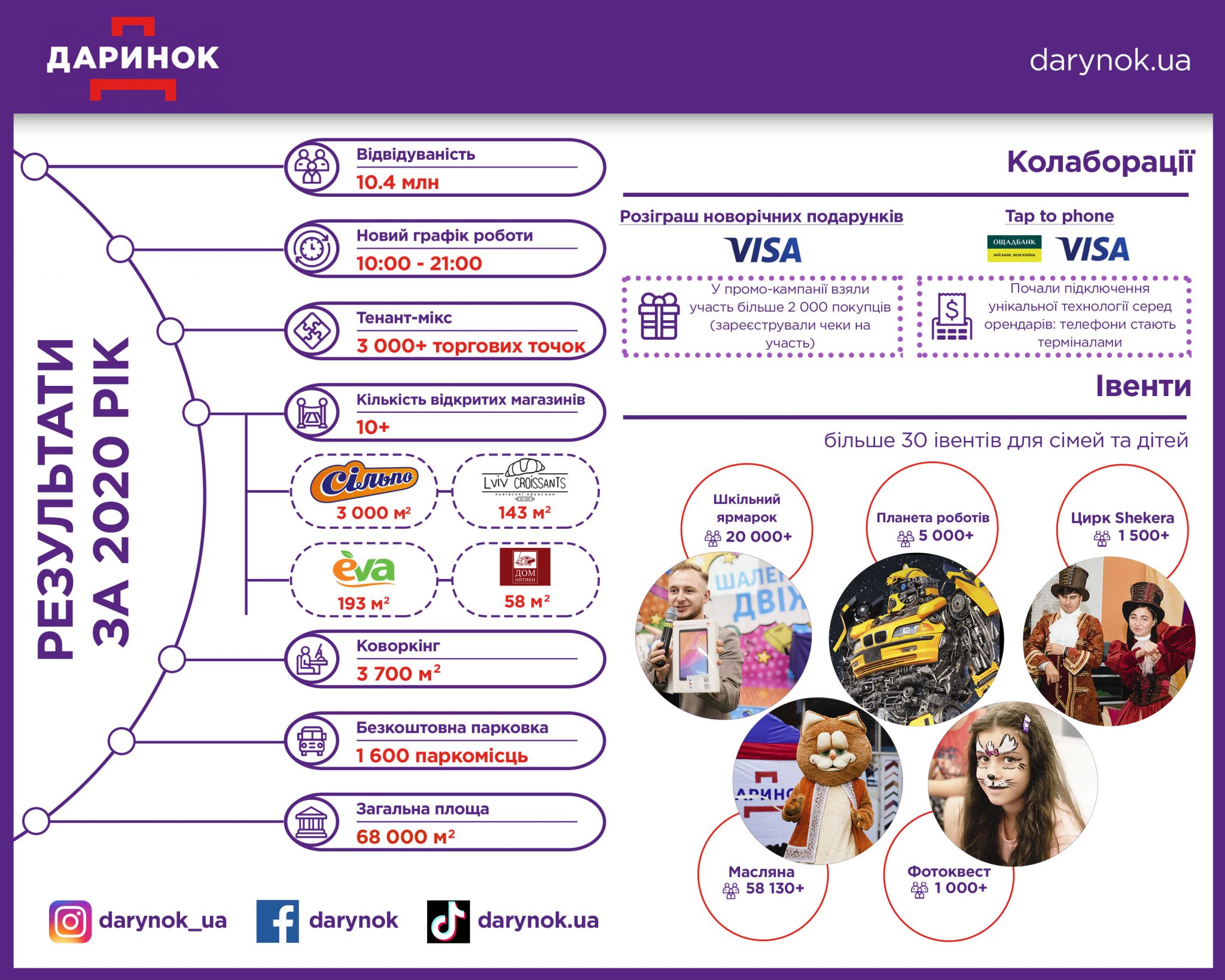 2020 год был кризисным для всего бизнеса. Адаптируясь под новые реалии, Дарынок принял несколько стратегических решений. В частности, продлил график работы и запустил промо-акции, что помогло увеличить футфол и уменьшить разницу посещаемости с предыдущим годом. В результате, в 2020 в маркет-молл пожаловали около 10,4 млн гостей, что лишь на 12% меньше, чем в 2019.
