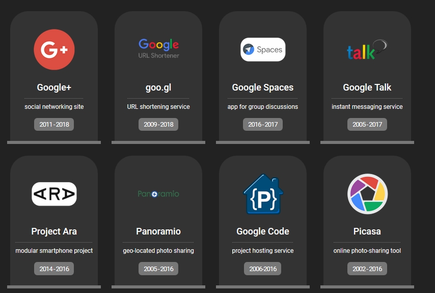 Полную версию закрытых проектов Google можно посмотреть в Инфографике. Следите за обновлениями RAU и вы всегда будете в курсе всего самого главного.
