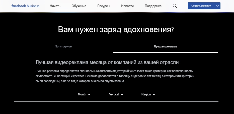 Устали? Приуныли? Креатив покинул вас? Facebook запустил раздел «Вдохновение» для рекламодателей. В нем можно найти примеры лучшей рекламы месяца компаний в выбранной отрасли. Реклама определяется специальным алгоритмом, который учитывает такие критерии, как вовлеченность, окупаемость инвестиций и креатив. В еще одной вкладке можно найти рекламу, выбранную непосредственно экспертами Facebook Creative Shop.