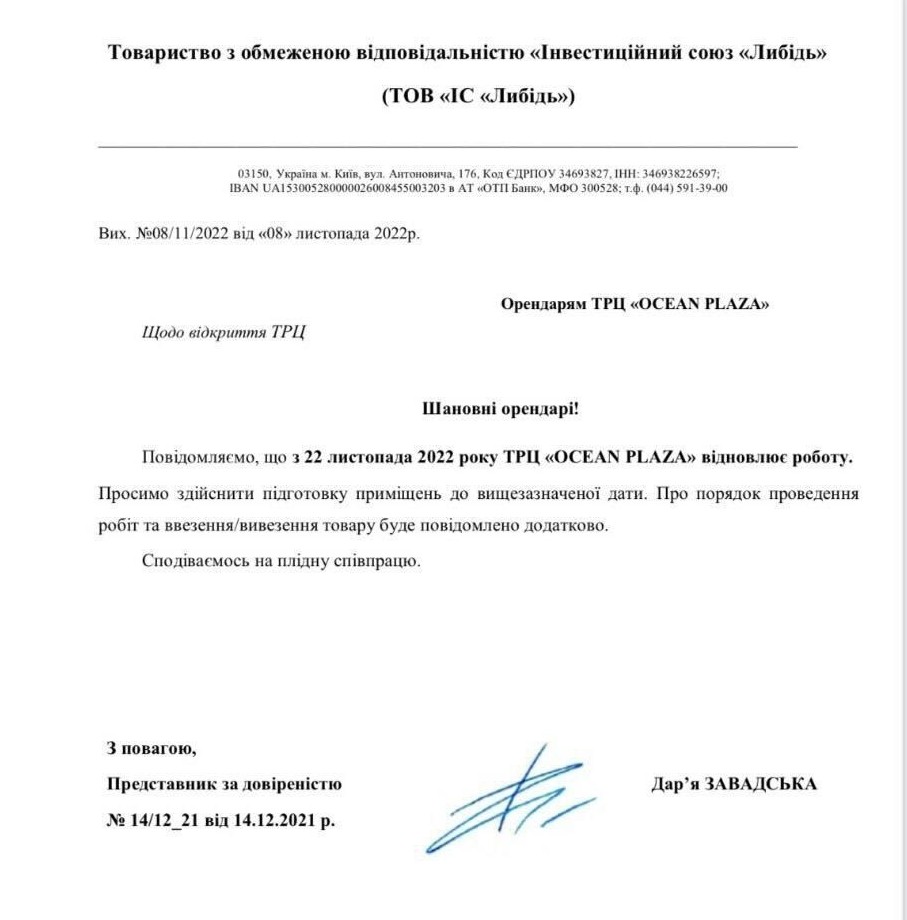 В частности, украинское издение Forbes приводит письмо к арендаторам, где указано, что с 22 ноября 2022 года ТРЦ Ocean Plaza возобновляет работу. “Просим осуществить подготовку помещений к вышеупомянутой дате”, – говорится в письме.