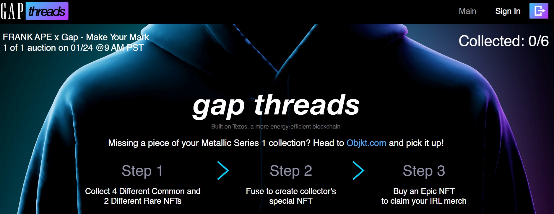 Мировой ритейлер одежды Gap запустил свою первую геймифицированную NFT-коллекцию. Как сообщает Delo.ua с ссылкой на сайт gap.com она базируется на платформе Tizen. В коллекции толстовок представлены четыре типа NFT: common (обычные), rare (редкие), epic и one-of-a-kind. Те, кто купит четыре обычных и два редких NFT, получит возможность купить epic NFT, а это, в свою очередь, дает возможность приобрести NFT типа one-of-a-kind и получить физическую толстовку Gap x Frank Ape. Стоимость токенов от 2 tez (около $8,3) до 100 tez (около $415). Аукцион, на котором выставлен NFT One of a Kind, стартовал 24 января.