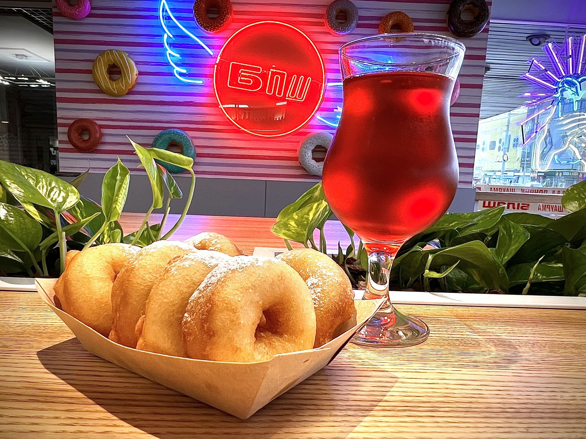 В меню кафе есть шаурма, салаты, фалафель. Также здесь можно полакомиться двумя видами эксклюзивных пончиков от Ponchyk Boy за 59 гривен (“Ави” с кремом с халвой и “Леви” с апельсином и имбирем).
