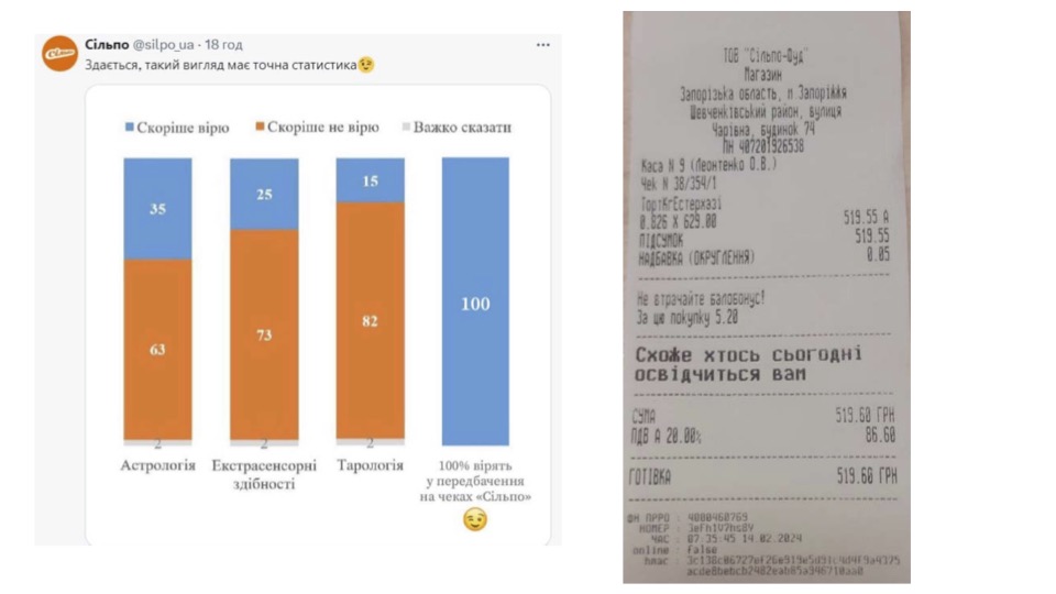 Но один из недавних опросов, показал, что многие украинцы также верят астрологам, экстрасенсам и тарологам. Мы не поняли, почему в этом списке нет того, во что верят 100% украинцев — это предсказания на чеках “Сільпо”. Поэтому мы создали свою собственную статистику.