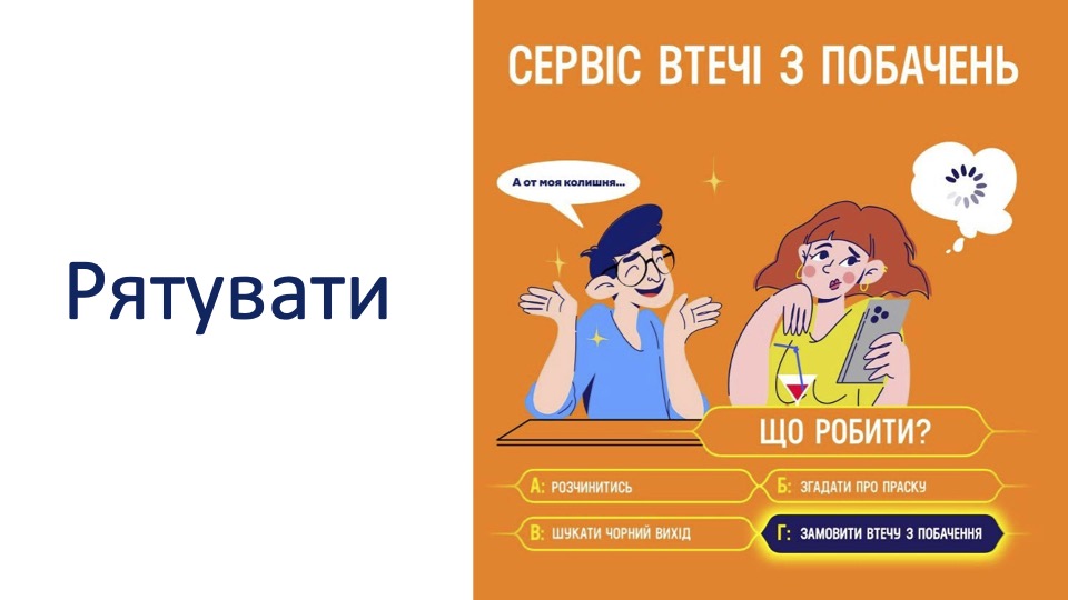 Но иногда во время первого свидания не все идет так, как хотелось бы. С него хочется сбежать, чтобы заняться чем-то более приятным. Мы решили зайти и на территорию этих эмоций тоже. Поэтому, мы создали сервис побега со свиданий. Все работало довольно просто: В чат-боте нужно было нажать определенную кнопку, после этого человек получал звонок и получал перечень проводов (неожиданный приезд бабушки, болезнь кота и т.д.), чтобы можно было встать и покинуть неудачное свидание.