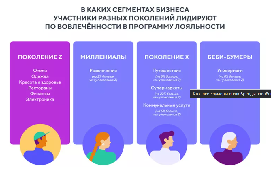 Зумеры более вовлечены в программы лояльности, чем представители других поколений. Также зумеры лидируют по количеству сегментов бизнеса, в программах лояльности которого они участвуют активнее остальных поколений. Так, зумеры — лидеры сразу в шести сегментах, в то время как миллениалы — только в одном.