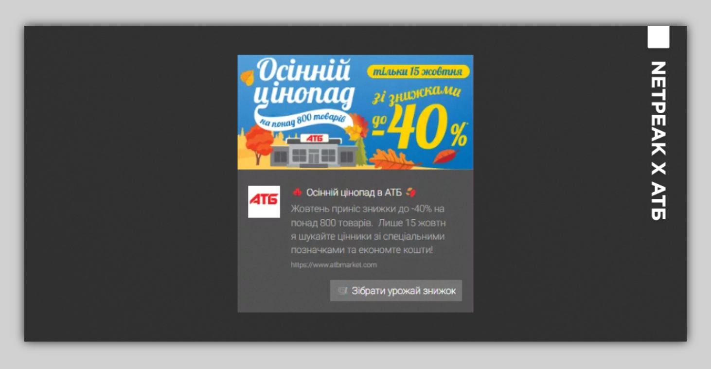 Ежедневные новости с фронта и международной арены, трагедии и обстрелы, перенасыщение инфополя количеством эмоциональных новостей – это все современные реалии каждого украинца. Проанализировав медийное пространство, в котором живут клиенты нашего партнера АТБ, команда Netpeak Ukraine понимала, что даже суперклассные предложения могут теряться в этом потоке информации. Поэтому мы решили использовать в нашей стратегии работу с push-уведомлениями (короткие сообщения, которые веб-ресурс рассылает своим подписчикам на компьютеры и мобильные устройства).