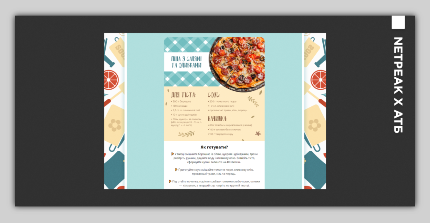 При анализе аудитории мы обнаружили, что достаточно большая доля базы клиентов АТБ – это женщины, поэтому решили поэкспериментировать с добавлением образовательного контента в план: создали концепт и запустили кулинарную рубрику с рецептами и подборкой продуктов, которые можно купить в сети.