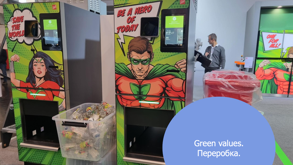 Отдельная важная тема – это Green values и переработка. В этом году на выставке был очень большой павильон с разработками по переработке мусора и пластика, именно в этот павильон были огромные очереди. Посетители внимательно изучали все аппараты по переработке и узнавали как они работают.