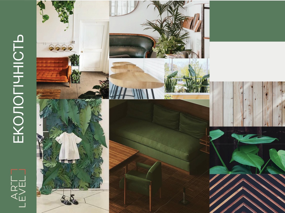 Экологичность. В этом концепте обычно используется много натуральных материалов (дерево, камень, естественные листья, растения), естественная цветовая гамма (коричневый, зеленый, серый и другие) и много пространства в оформлении, чтобы покупатель чувствовал себя как на свежем воздухе.