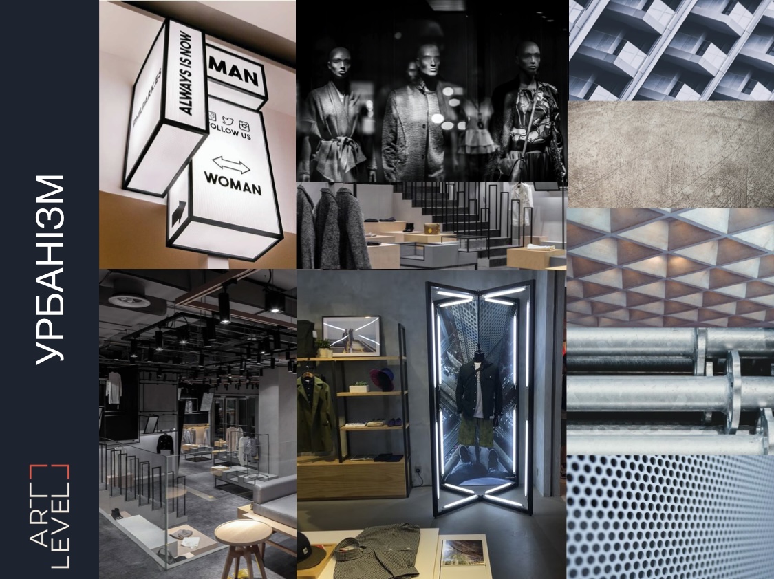 Урбанизм. Этому стилю свойственны фактуры города, надписи, граффити, геометрия форм и сочетание различных масс (металл, бетон. кирпич).