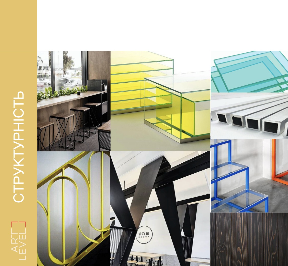 Структурность, которая характеризуется графичностью, видимым каркасом в дизайне, минимумом материалов, а также доминированием в оформлении линий, пятен и точек.