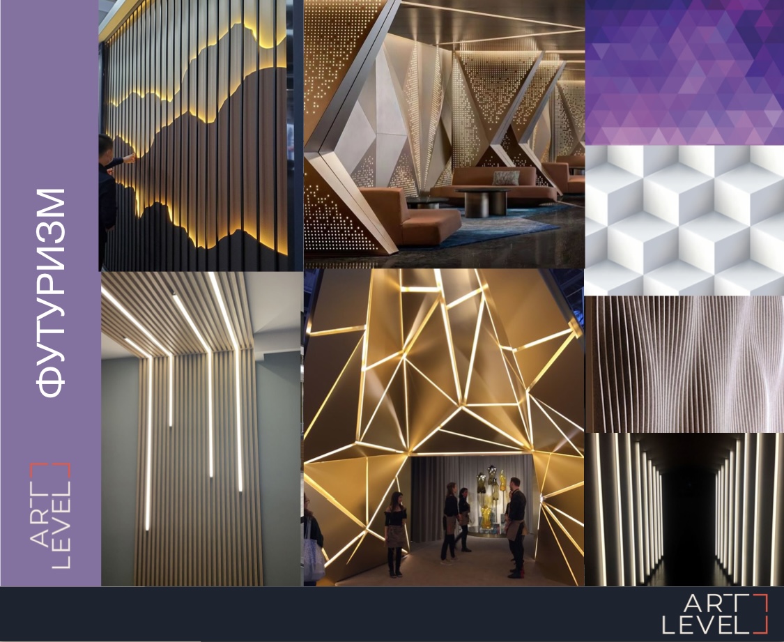 Футуризм – это концепт будто из будущего, которому свойственны полигональные формы и фигуры, 3D-поверхности, объем и световые линии.
