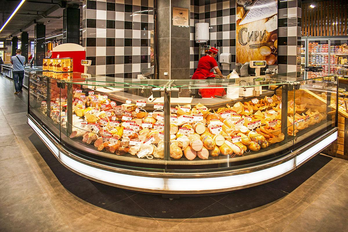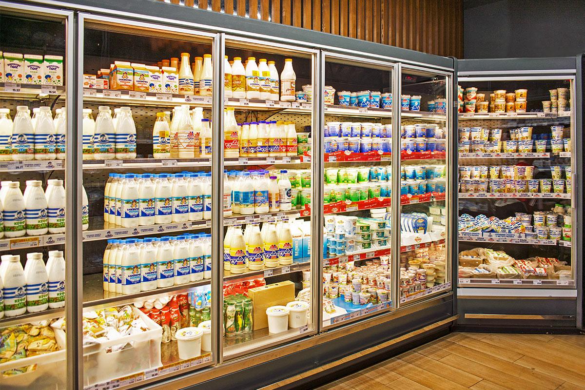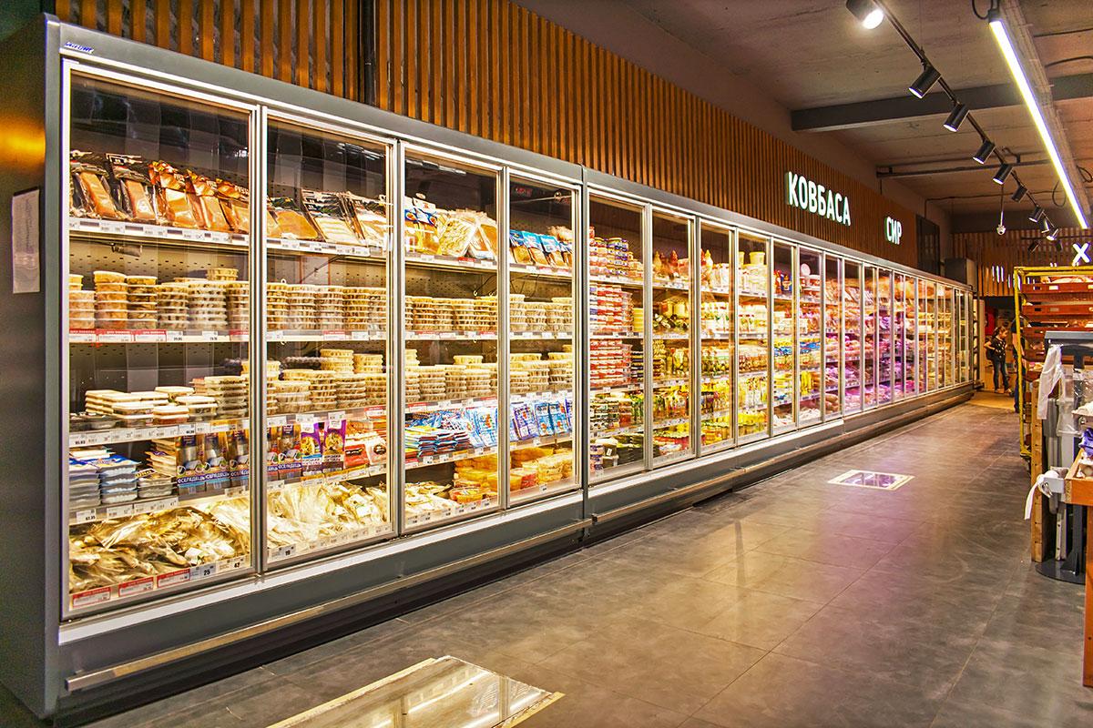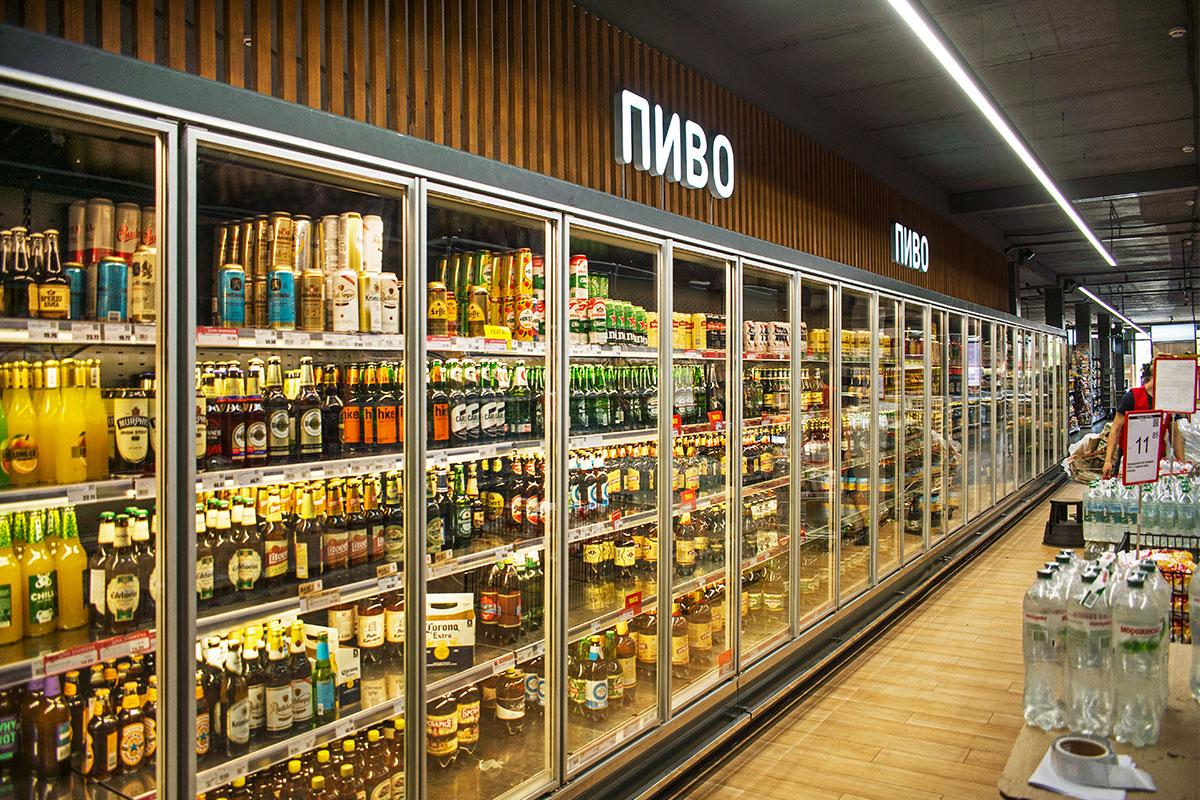 Пристенные витрины с энергосберегающими стеклянными дверьми применены в торговом зале для продажи фасованной гастрономии, пресервов и напитков.