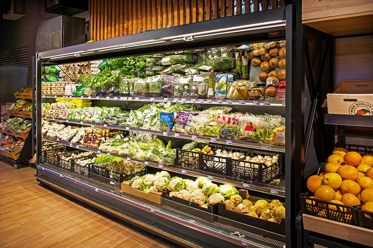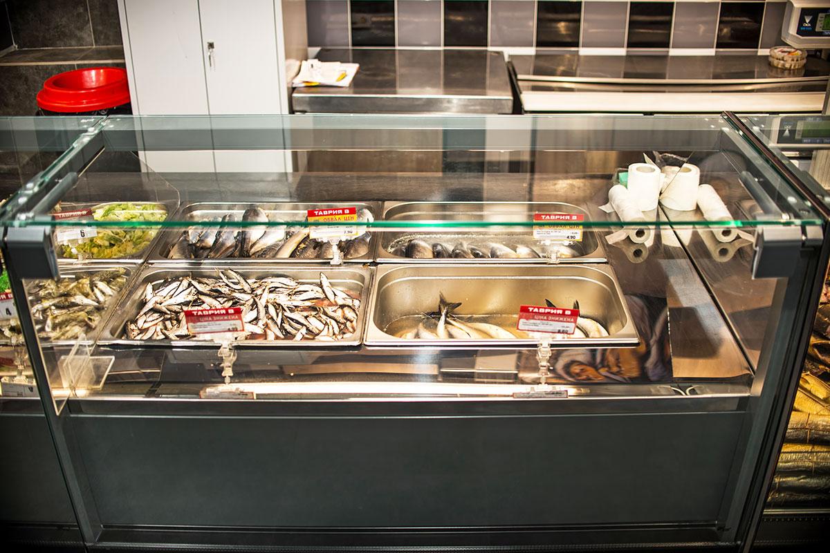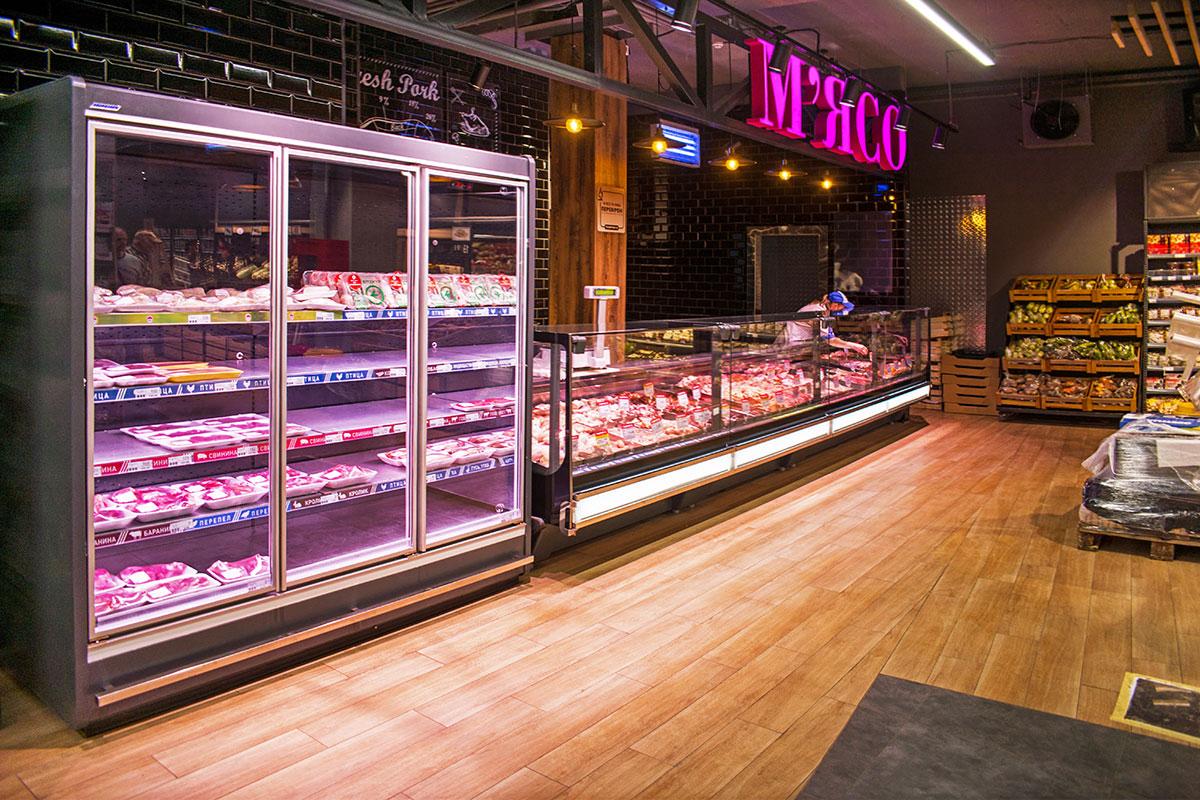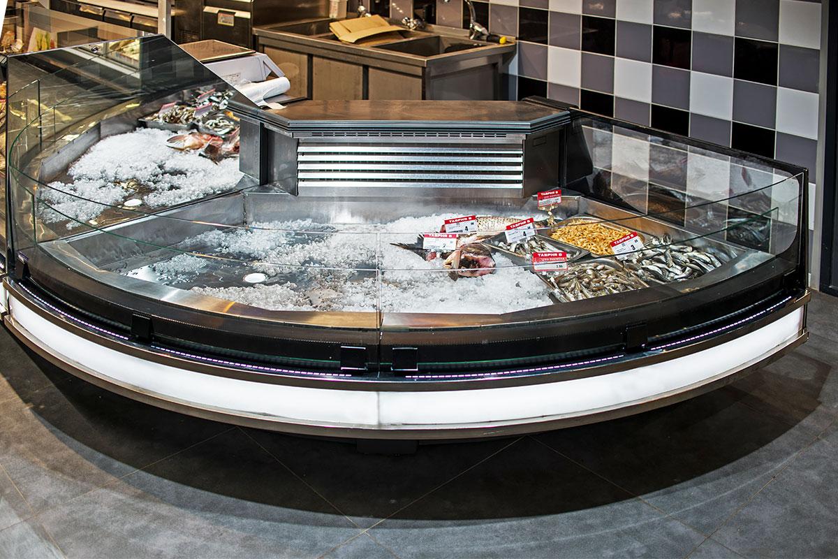 Например, угловой модуль для продажи в режиме самообслуживания свежей рыбы на льду. Для пристенных витрин были выбраны модели с энергосберегающими распашными дверями.