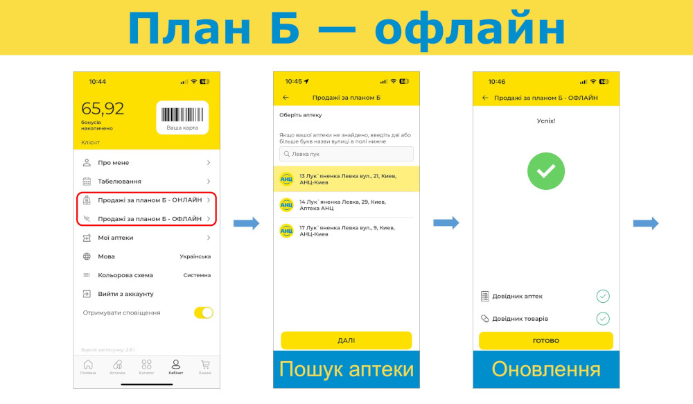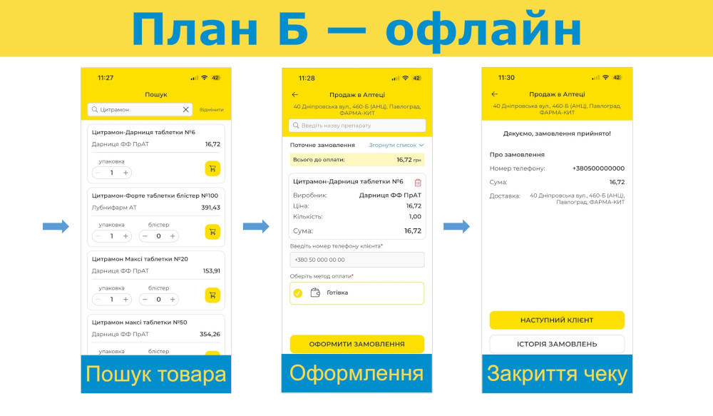 У каждого сотрудника в клиентском приложении есть «План Б» для онлайн-клиентов и офлайн. Это позволяет обслуживать без энергоснабжения. Сотрудник утром находит свою аптеку и с помощью мобильного интернета качает файл, в котором есть информация об ассортименте данной точки и ценах, актуальных в течение дня. Когда свет появляется, сотрудник синхронизирует данные и чеки отправляются в налоговую, их можно напечатать или отправить клиенту онлайн.