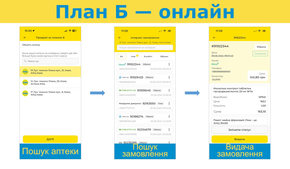 Если заказы онлайн, то работник видит их все на выбранной аптеке. По номеру заказа может найти все, что заказывал клиент, увидеть оплаченно или нет.