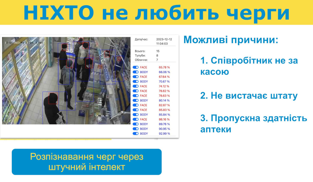 Мы знаем, что люди не любят очереди. Поэтому встроили камеры в точках с искусственным интеллектом, распознающими очереди.