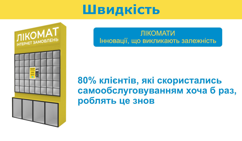 - Пропускная способность аптеки. Мы придумали ликоматы. Когда клиент делает онлайн заказ, работник собирает его и кладет в ячейку. Клиент оплачивает в приложении и в нем нажимает открыть ячейку. Наш опрос показал, что 80% клиентов, один раз использовавших ликомат самостоятельно, второй раз будут им пользоваться, не подходя к кассам.