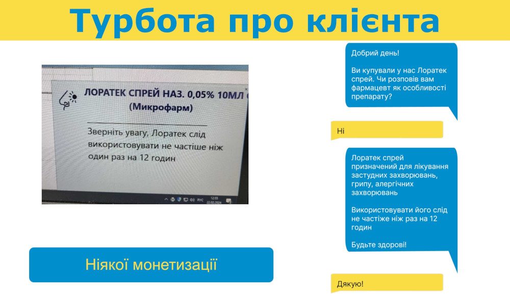 Также в сети АНЦ есть забота о клиенте. Если он покупает товар, который имеет специфическую дозировку или противопоказания, работник обязательно об этом говорит. Если по каким-то причинам забывает это сделать, мы отправляем сообщение в мессенджер с вопросом, рассказали ли на кассе об этом препарате. Если нет, даем информацию.