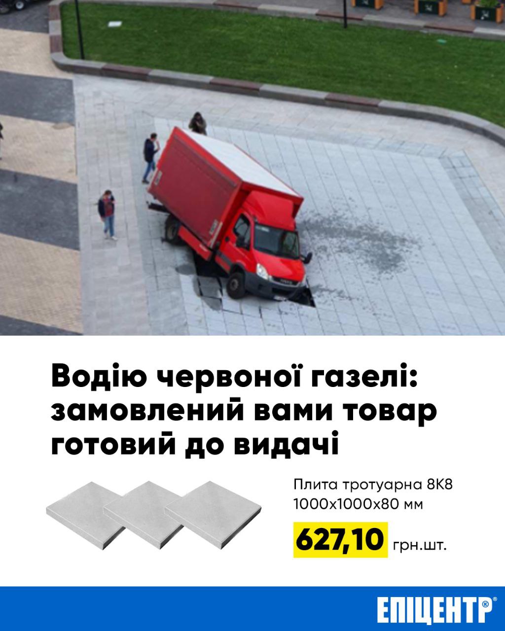 В начале сентября в центре Киева возле станции метро “Арсенальная” под грузовым автомобилем просела и обвалилась плитка возле фонтана. Казалось бы, о чем тут шутить ритейлерам. Но в Эпицентр нашли решение и предложили водителю красной газели заказать у них плитку для восстановления повреждений.