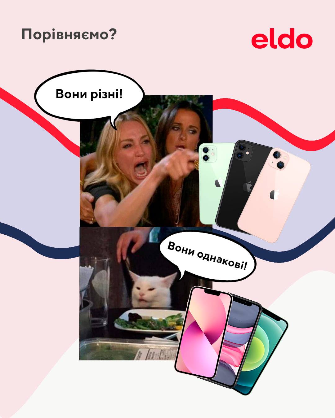 В этом году новый iPhone не вызвал такого мем-ажиотажа, как в прошлые годы. Однако и здесь Eldorado нашел как иронизировать – ритейлер предложил сравнить его с прошлыми версиями, вспомнив известный мем с девушками и котом.