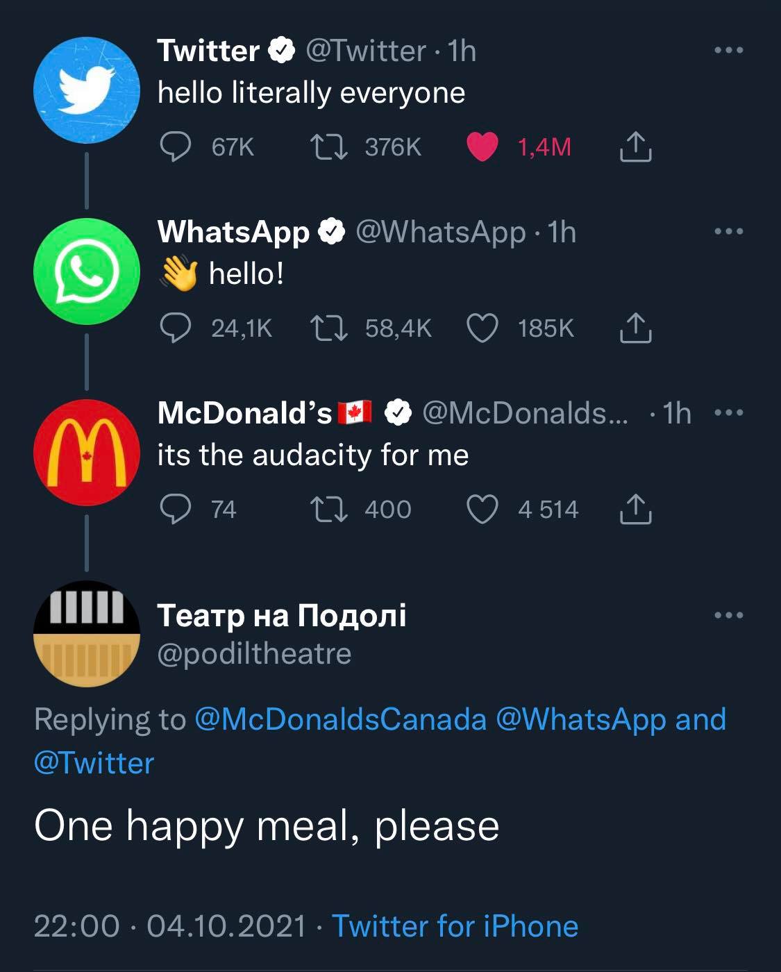 Немало пользователей и брендов переместилось в Twitter, где с удовольствием напомнили о себе. Там, например, отметился McDonald’s и (в той же ленте комментариев) Театр по Подоле, который воспользовался возможностью заказать хэппи-мил.