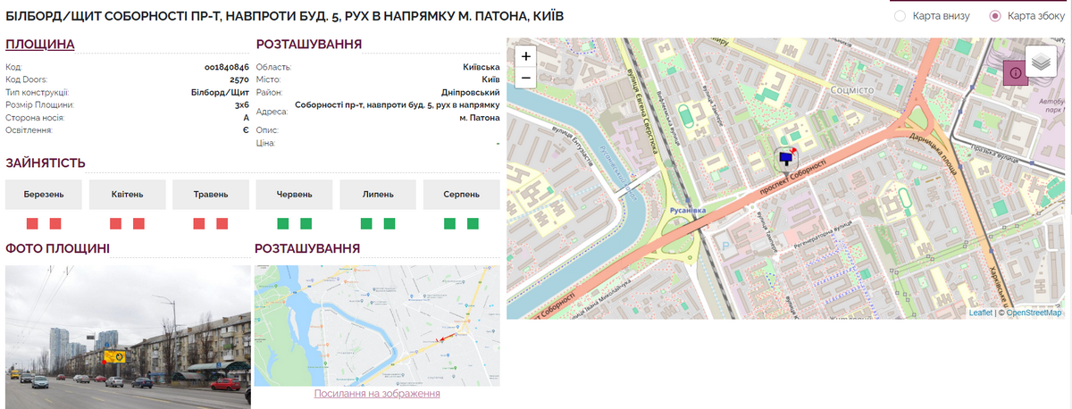 - Регулярное обновление базы актуальными фотографиями рекламных поверхностей по всей Украине.