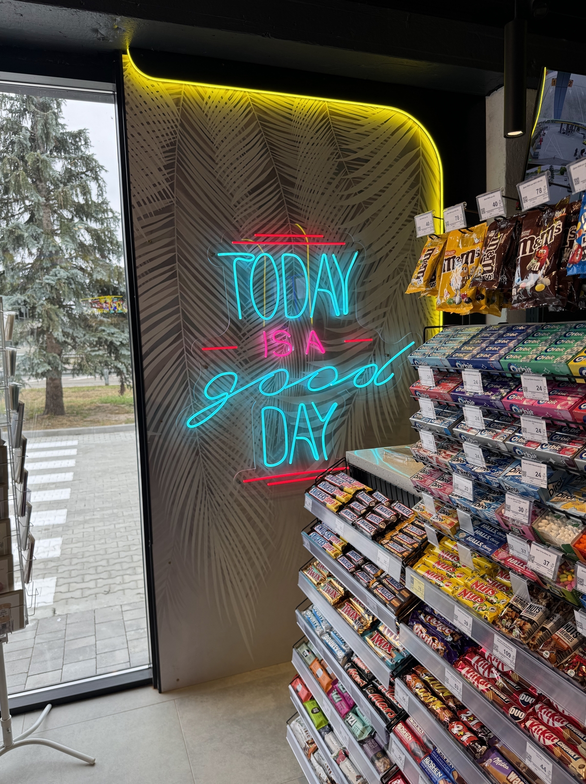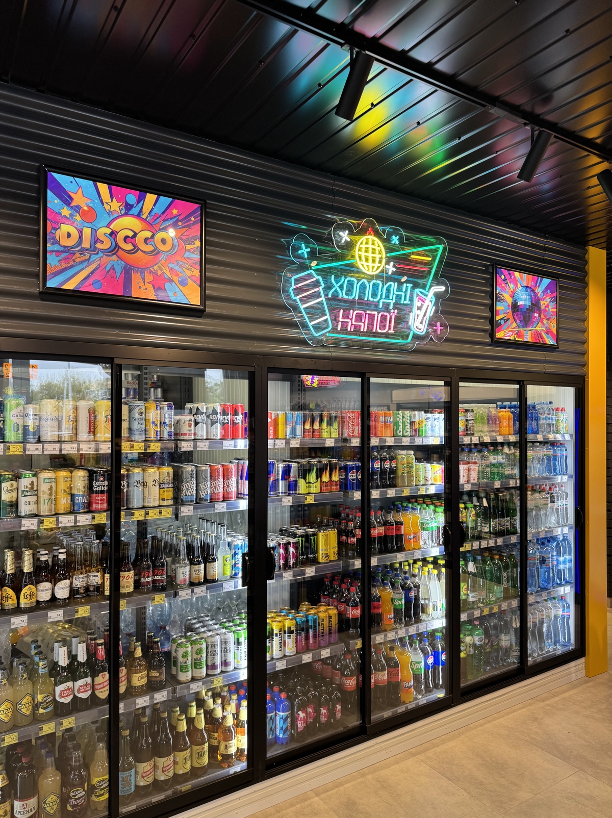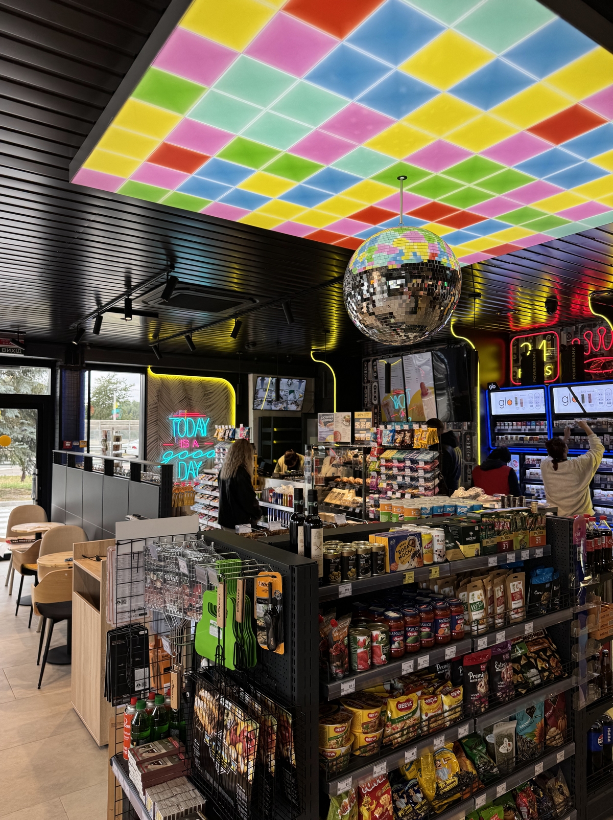 АЗК выполнена в диско-стиле: яркие неоновые цвета, декоративные элементы, отсылающие к эстетике 80–90-х, и световые акценты, создающие атмосферу вечеринки даже во время остановки на трассе. Таким образом продолжается традиция оформлять станции в тематическом стиле, даря гостям не только сервис, но и эмоции.